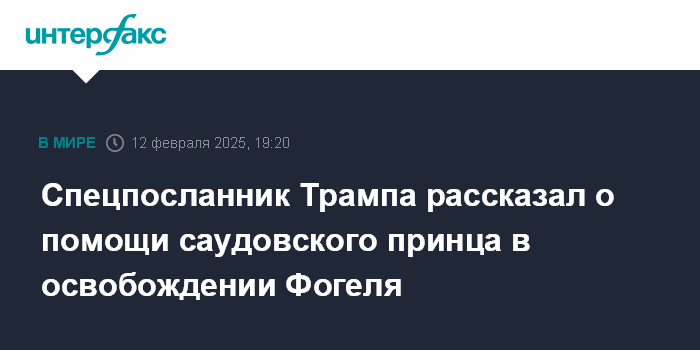 Москва. 12 февраля. INTERFAX.RU - Спецпосланник президента США по Ближнему Востоку Стив Уиткофф заявил, что наследный принц Саудовской Аравии Мухаммед бен Салман Аль Сауд сыграл определенную роль в освобождении бывшего сотрудника американского посольства в Москве Марка Фогеля, передает CNN.