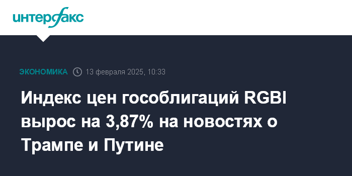 Москва. 13 февраля. INTERFAX.RU - Индекс цен гособлигаций RGBI, являющийся основным ценовым индикатором сектора облигаций федерального займа (ОФЗ), вырос в начале торгов четверга на "Московской бирже" на 3,87%, до 107,41 пункта, на ожиданиях снижения геополитических рисков после состоявшегося накануне телефонного разговора президентов России и США.