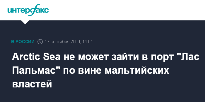 Москва. 17 сентября. INTERFAX.RU - В СКП РФ заявляют, что сухогруз "Arctic Sea" не может зайти в испанские порты из-за действий властей республики Мальта.