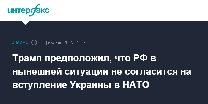 Москва. 13 февраля. INTERFAX.RU - Президент США Дональд Трамп предположил, что Россия при урегулировании украинского кризиса не согласится на вступление Киева в НАТО.
