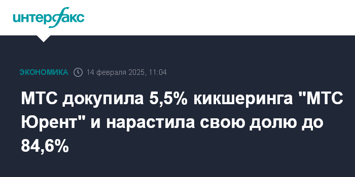 МТС вошла в капитал "Юрент" в начале 2022 года, а в январе 2024 года стала ее контролирующим совладельцем. "МТС Юрент" является одним из пяти ключевых нетелеком-направлений в рамках экосистемы МТС.