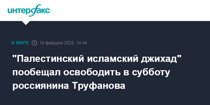 Москва. 14 февраля. INTERFAX.RU - В группировке "Палестинский исламский джихад" заявили о планах освободить 15 февраля взятого в заложники 7 октября 2023 года гражданина России Александра Труфанова. Об этом боевое крыло группировки "Сарая аль-Кудс" сообщило в Telegram.