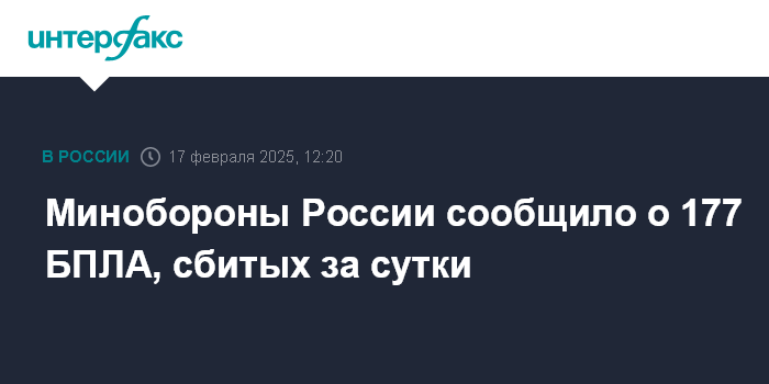 Москва. 17 февраля. INTERFAX.RU - За сутки российские военные сбили украинскую ракету "Нептун", переоборудованную для поражения наземных целей, и 177 украинских дронов, из них 102 вне зоны специальной военной операции, заявили в Минобороны.