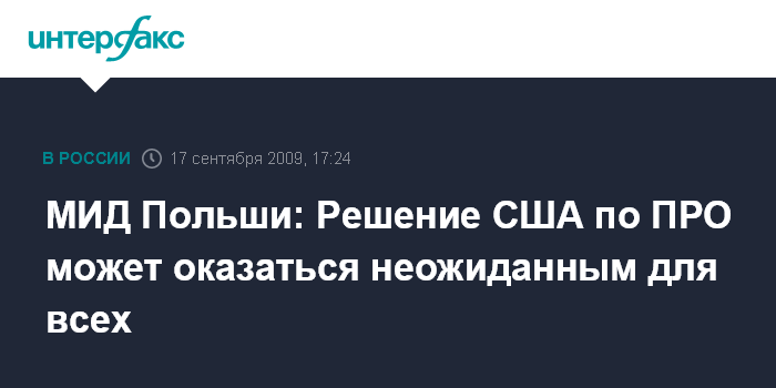 Варшава. 17 сентября. INTERFAX.RU - Министр иностранных дел Польши Радослав Сикорский сказал в четверг, что решение руководства США по поводу объектов ПРО в Восточной Европе может отличаться от заявлений, звучавших до сих пор, сообщает агентство ЭФЭ.