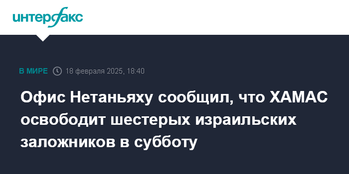 Москва. 18 февраля. INTERFAX.RU - Шестеро израильских заложников выйдут на свободу в субботу в рамках первого этапа соглашения с палестинской группировкой ХАМАС, подтвердил во вторник офис премьер-министра Израиля Биньямина Нетаньяху.