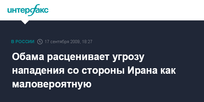 Москва. 17 сентября. INTERFAX.RU - Президент США Барак Обама считает маловероятной угрозу нападения со стороны Ирана.