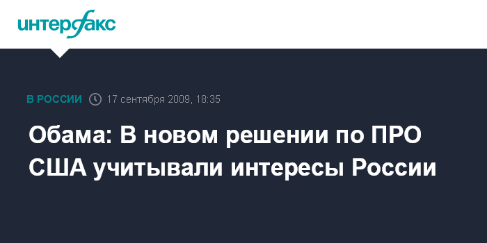Москва. 17 сентября. INTERFAX.RU - Президент США Барак Обама заявил, что новое решение по ПРО учитывает интересы России, и выразил готовность сотрудничать с РФ в этой области.