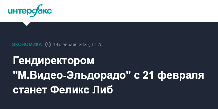 Москва. 19 февраля. INTERFAX.RU - Совет директоров ПАО "М.Видео" ("М.Видео-Эльдорадо") утвердил Феликса Либа на должность генерального директора с 21 февраля, сообщила компания.
