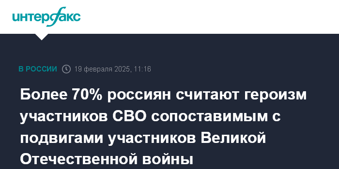 Москва. 19 февраля. INTERFAX.RU - Почти три четверти россиян (73%) придерживаются мнения о том, что участники специальной военной операции такие же герои, как участники Великой Отечественной войны, свидетельствуют данные опроса ВЦИОМ, опубликованные в среду на официальном сайте социологического центра.