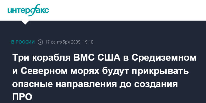 "Три корабля, которые находятся в Средиземном и Северном морях, будут иметь возможность обеспечивать системы раннего предупреждения о ракетном нападении. Как раз это вписывается в параметры нашего бюджета и позволяет обеспечить защиту от нападения ракет сейчас и на период, пока наша система (ПРО) не заработает", - сказал Картрайт.