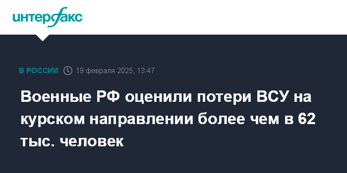 Москва. 19 февраля. INTERFAX.RU - Общие потери украинских войск на курском направлении за время боевых действий превысили 62 тысячи военнослужащих, сообщило министерство обороны РФ в среду.