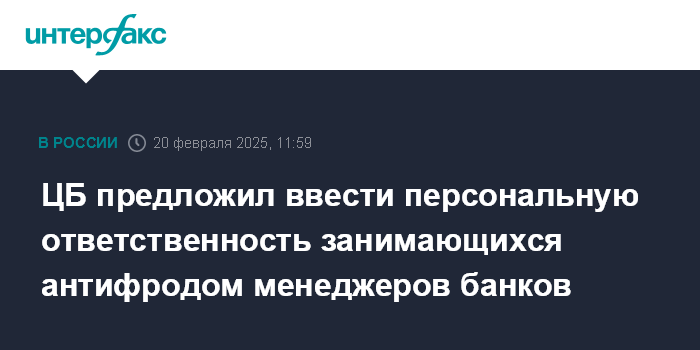 Москва. 20 февраля. INTERFAX.RU - Банк России предлагает ввести персональную ответственность топ-менеджеров кредитных организаций, которые отвечают за организацию антифрод-процедур в банках, сообщила на пресс-конференции глава ЦБ Эльвира Набиуллина.