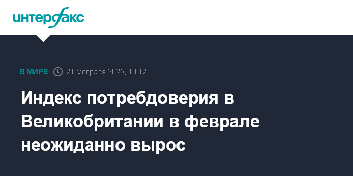 Москва. 21 февраля. INTERFAX.RU - Индекс потребительского доверия в Великобритании в феврале вырос до минус 20 пунктов по сравнению с минус 22 пунктами месяцем ранее, сообщается в отчете аналитической компании NIQ GfK.