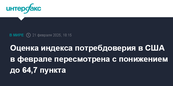 Москва. 21 февраля. INTERFAX.RU - Индекс потребительского доверия в США, рассчитываемый Мичиганским университетом, в феврале составил 64,7 пункта.