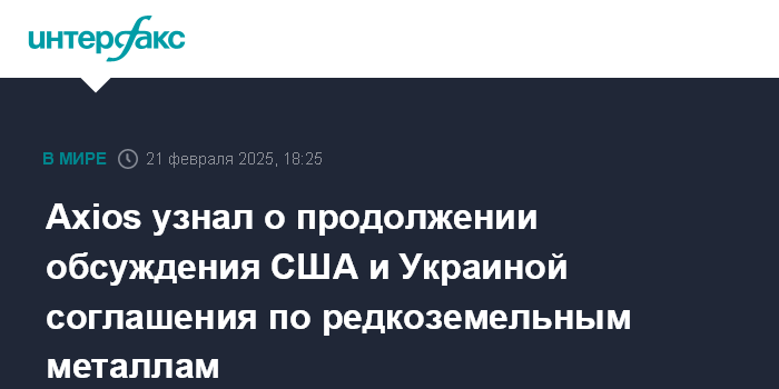Москва. 21 февраля. INTERFAX.RU - Вашингтон и Киев продолжают вести переговоры о соглашении по редкоземельным металлам, сообщает Axios со ссылкой на источники.