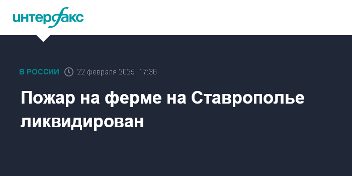 Москва. 22 февраля. INTERFAX.RU - Пожар на животноводческой ферме в Ставропольском крае полностью потушен, сообщила пресс-служба ГУ МЧС по региону.