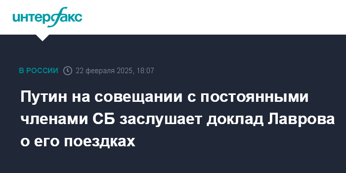Москва. 22 февраля. INTERFAX.RU - Президент РФ Владимир Путин на оперативном совещании с постоянными членами Совбеза РФ попросил главу МИД России Сергея Лаврова доложить о его последних поездках.