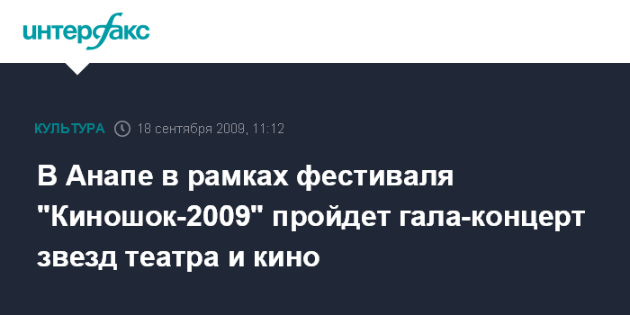 Москва. 18 сентября. INTERFAX.RU - В Анапе (Краснодарский край) в рамках XVIII открытого фестиваля кино стран СНГ, Латвии, Литвы и Эстонии "Киношок-2009" состоится гала-концерт артистов театра и кино. "Гала-концерт пройдет в 20.00 мск пятницы на сцене Городского театра", - сообщили агентству "Интерфакс-Юг" в пятницу в пресс-службе мэрии Анапы. В мероприятии примут участие народная артистка РСФСР Людмила Зайцева, народная артистка РСФСР Людмила Хитяева, Олег Акулич. Кроме того, ожидается участие народного артиста Узбекистана Рустама Сагдулаев и других популярных актеров.