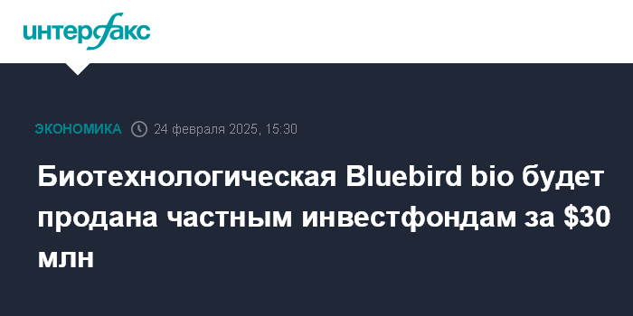 Москва. 24 февраля. INTERFAX.RU - Американская биотехнологическая Bluebird bio Inc. сообщила, что продает себя частным инвестиционным фирмам Carlyle и SK Capital примерно за $30 млн.