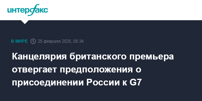 Москва. 25 февраля. INTERFAX.RU - Министр безопасности Великобритании Дэн Джарвис предположил, что вопрос о возвращении России в G7 будет предметом обсуждения с союзниками Лондона, Даунинг-стрит отвергает эту возможность.