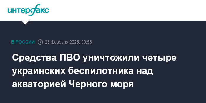 Москва. 26 февраля. INTERFAX.RU - Над акваторией Черного моря уничтожены четыре дрона ВСУ, сообщил губернатор Севастополя Михаил Развожаев в среду.