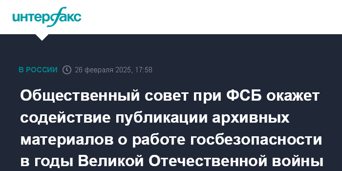 "В год 80-летия Великой Победы тема исторической правды заслуженно становится одной из главных для всех мероприятий в рамках этого общенародного праздника. С учетом высокой общественной значимости информации из архивных документов и растущего интереса к ней со стороны граждан, наш совет окажет максимальное содействие ФСБ России в публикации таких материалов, используя различные инструменты и форматы",- сказал Титов, чьи слова приводят в Центре общественных связей (ЦОС) ФСБ.