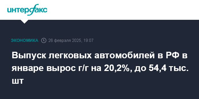 Москва. 26 февраля. INTERFAX.RU - Выпуск легковых автомобилей в РФ в январе вырос в годовом выражении на 20,2%, до 54,4 тыс. шт., сообщила Федеральная служба государственной статистики (Росстат) в среду.