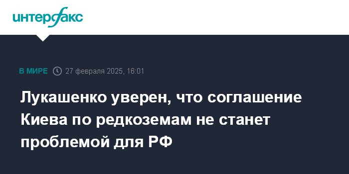 Москва. 27 февраля. INTERFAX.RU - Соглашение между США и Украиной по редкоземельным металлам может настораживать Россию, но не станет для нее проблемой, если будет иметь чисто экономический характер, такое мнение высказал президент Белоруссии Александр Лукашенко.