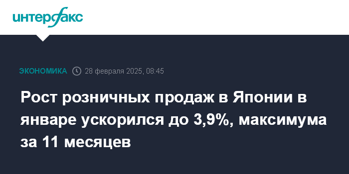 Москва. 28 февраля. INTERFAX.RU - Розничные продажи в Японии в январе увеличились на 3,9% по сравнению с тем же месяцем прошлого года, по данным министерства экономики, торговли и промышленности страны.