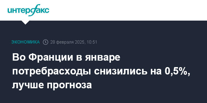 Москва. 28 февраля. INTERFAX.RU - Во Франции в январе потребительские расходы снизились на 0,5% по сравнению с предыдущим месяцем, сообщило Национальное статистическое управление Insee.