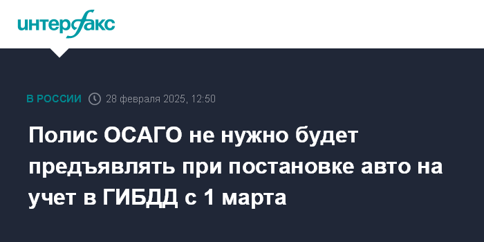 Москва. 28 февраля. INTERFAX.RU - Требование наличия полиса ОСАГО при постановке автомобиля на учет в ГИБДД отменяется с 1 марта, соответствующие законодательные изменения в закон "О государственной регистрации транспортных средств в Российской Федерации" вступают в силу с этой даты.