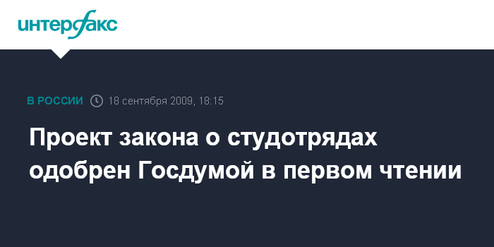 Москва. 18 сентября. INTERFAX.RU - Госдума приняла в первом чтении внесенный правительством законопроект, направленный на создание и деятельность студенческих отрядов.