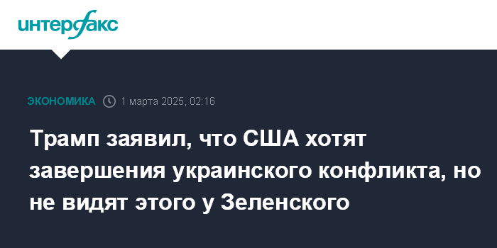 Москва. 1 марта. INTERFAX.RU - Президент США Дональд Трамп заявил, что не видит у президента Украины Владимира Зеленского желания урегулировать конфликт с РФ.