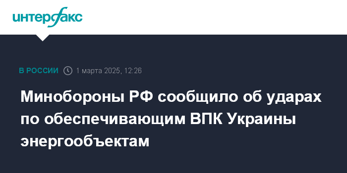 Москва. 1 марта. INTERFAX.RU - Вооруженные силы России нанесли удары по украинским энергетическим объектам, аэродромам и местам хранения беспилотников, сообщило Минобороны РФ в субботу.