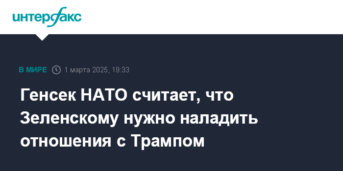 Москва. 1 марта. INTERFAX.RU - Президенту Украины Владимиру Зеленскому следует восстановить отношения с президентом США Дональдом Трампом, заявил в субботу генсек НАТО Марк Рютте в эфире телеканала ВВС.