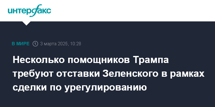 Москва. 3 марта. INTERFAX.RU - Некоторые помощники президента США Дональда Трампа считают, что украинский президент Владимир Зеленский должен уйти в отставку в рамках любой сделки по украинскому урегулированию, сообщает Bloomberg со ссылкой на европейского чиновника.