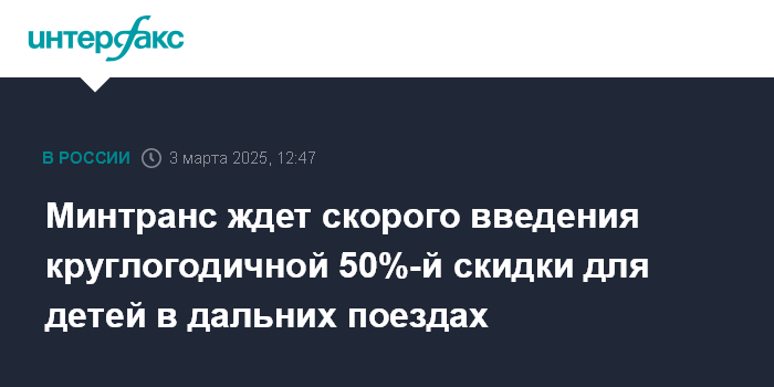 "В текущем году мы планируем перейти на субсидирование полки, на адресное субсидирование, но ключевое - это предоставление круглогодичной льготы в размере 50% от взрослого тарифа на проезд железнодорожным транспортом в дальнем следовании всем детям гражданам России до 18 лет. Для этого разработан соответствующий проект постановления правительства, который уже сейчас в аппарате (правительства - ИФ)", - сказал он, напомнив, что это предложение было поддержано Госдумой в апреле 2024 года.