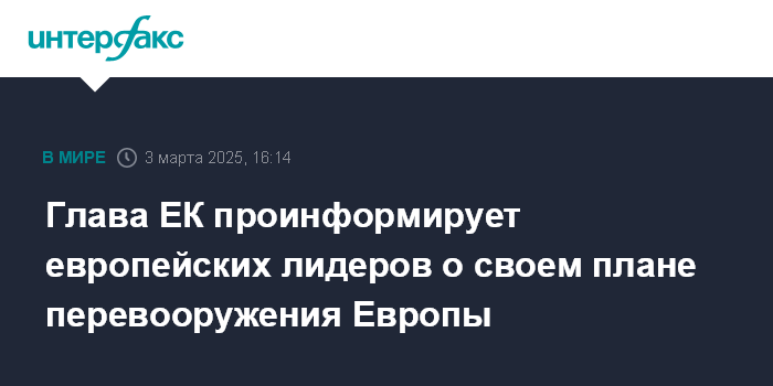 Москва. 3 марта. INTERFAX.RU - Председатель Еврокомиссии (ЕК) Урсула фон дер Ляйен заявила, что во вторник проинформирует письмом государства-члены ЕС о своем плане перевооружения Европы перед его обсуждением 6 марта на внеочередном саммите Евросоюза.
