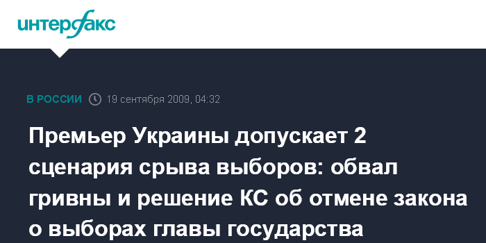 Днепропетровск. 19 сентября. ИНТЕРФАКС-УКРАИНА - Премьер-министр Украины Юлия Тимошенко заявила, что в стране сейчас существует два сценария срыва проведения президентских выборов - через решение Конституционного суда и обвал гривны.