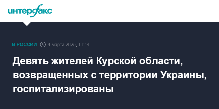 Москва. 4 марта. INTERFAX.RU - Девять жителей Курской области, возвращенных с территории Украины, госпитализированы, их состояние стабильное, сообщил помощник министра здравоохранения РФ Алексей Кузнецов.