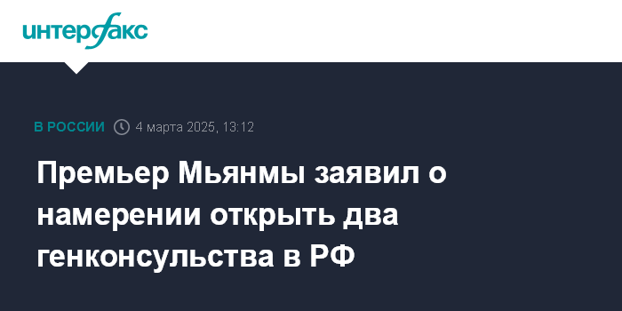 Москва. 3 марта. INTERFAX.RU - Премьер-министр Мьянмы Мин Аун Хлайн на встрече с главой российского правительства Михаилом Мишустиным заявил о намерении открыть два генеральных консульства в России.