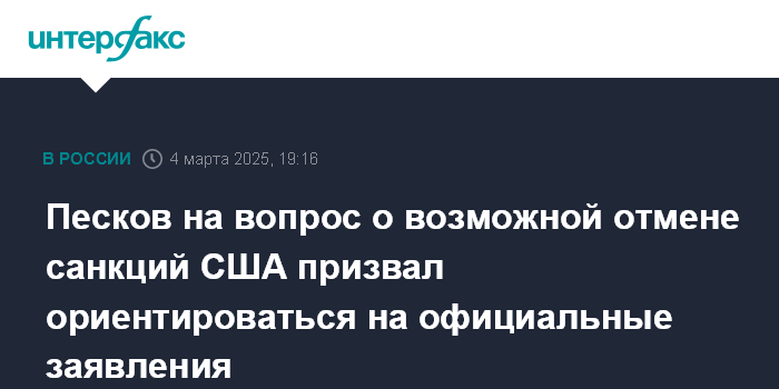 Москва. 4 марта. INTERFAX.RU - Пресс-секретарь президента РФ Дмитрий Песков, комментируя сообщения о возможной отмене антироссийских санкций США, заявил, что нужно ориентироваться только на официальные заявления, которые пока никто не делал.