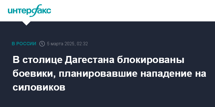 Москва. 5 марта. INTERFAX.RU - Национальный антитеррористический комитет (НАК) сообщил в ночь на среду, что в Махачкале блокированы четверо боевиков, планировавших теракт на объекте правоохранительных органов.