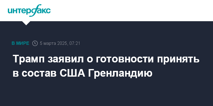 Москва. 5 марта. INTERFAX.RU - Соединенные Штаты будут согласны принять Гренландию в свой состав, если ее народ изъявит такое желание, сказал в среду президент США Дональд Трамп, выступая перед Конгрессом.