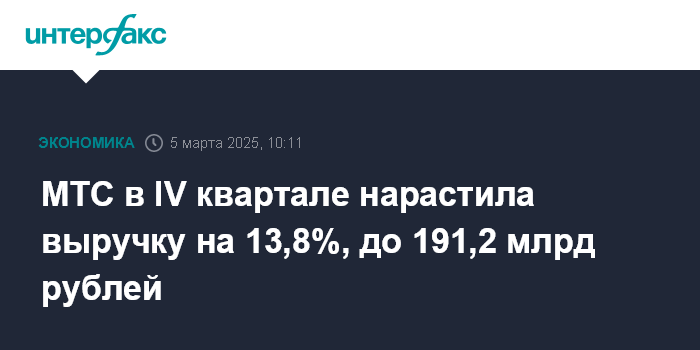 МТС в IV квартале нарастила выручку на 13,8%, до 191,2 млрд рублей