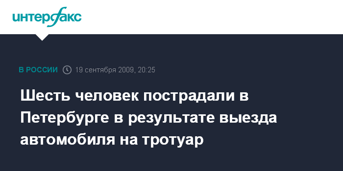 Санкт-Петербург. 19 сентября. ИНТЕРФАКС СЕВЕРО-ЗАПАД - В Красногвардейском районе Петербурга в субботу вечером автомобиль сбил пешеходов на тротуаре, пострадали шесть человек, сообщил "Интерфаксу" источник в правоохранительных органах.
