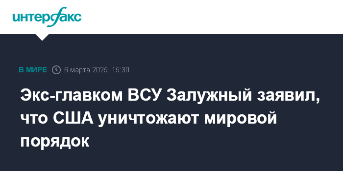 Москва. 6 марта. INTERFAX.RU - Посол Украины в Великобритании и бывший главнокомандующий ВСУ Валерий Залужный в четверг заявил, что Белый дом пытается нарушить мировой порядок.