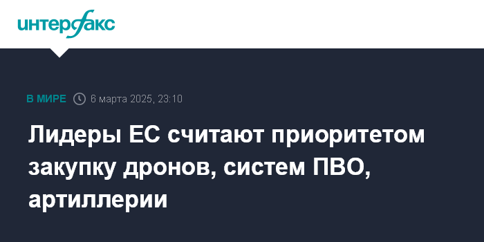 Москва. 6 марта. INTERFAX.RU - Лидеры стран Евросоюза договорились уделять особое внимание закупкам систем ПВО, беспилотников, высокоточной дальнобойной артиллерии для повышения своей обороноспособности, говорится в заявлении Евросовета.