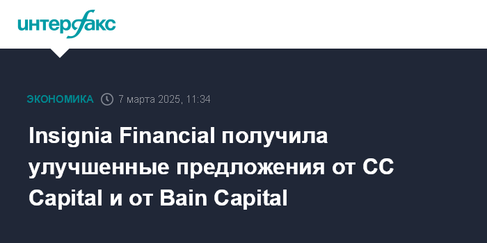 Москва. 7 марта. INTERFAX.RU - Австралийский поставщик финансовых услуг Insignia Financial получил улучшенные предложения о своей покупке со стороны как CC Capital Partners, так и Bain Capital.