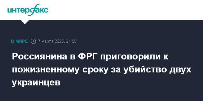 Москва. 7 марта. INTERFAX.RU - Россиянина в Германии приговорили к пожизненному заключению по обвинению в убийстве двух находившихся в стране на лечении украинских солдат после бытовой ссоры, сообщает в пятницу немецкий журнал Spiegel.
